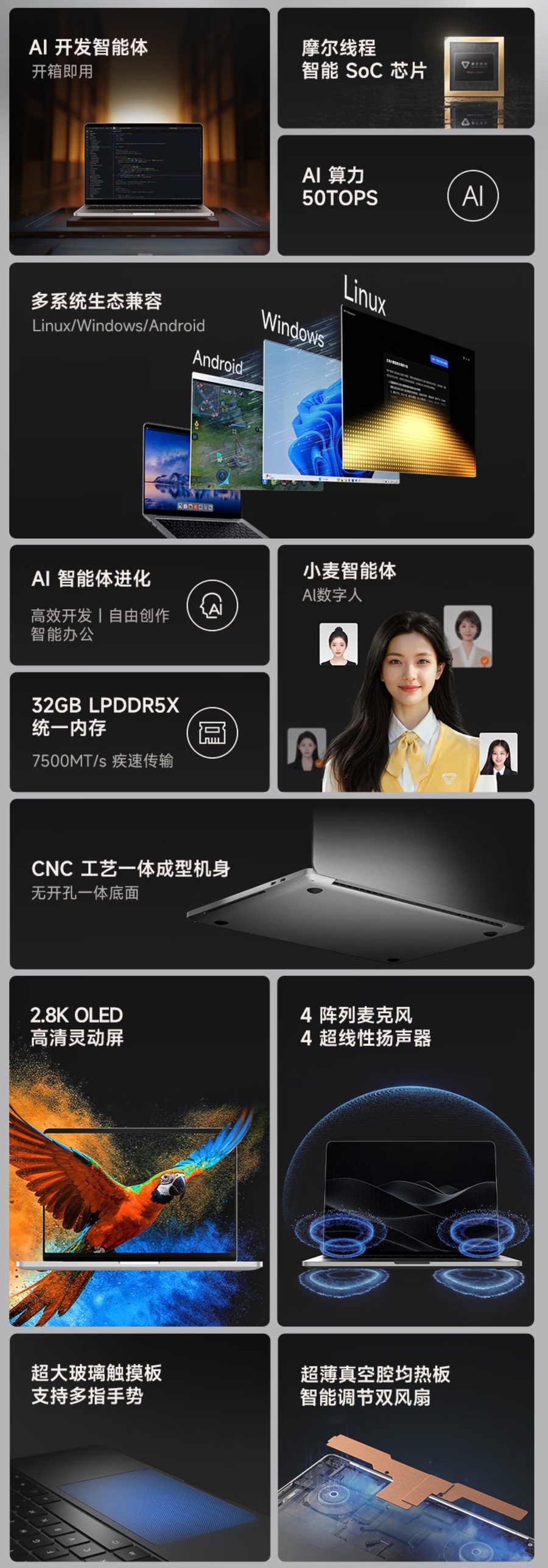 外观方面,MTT AIBOOK采用简洁的经典造型,机身运用6系列高强度铝金属,通过全CNC工艺一体成型,配合0.15mm高精度切割线条与无开孔一体底面,质感出众。该机配备了一块14英寸2.8K(2880×1800)OLED屏幕,支持120Hz刷新率与100% DCI-P3广色域,并支持180°开合。音频方面采用4阵列麦克风与4超线性扬声器组合,满足会议与娱乐需求。输入体验上,MTT AIBOOK配备了标准全尺寸低噪音键盘,采用人体工学曲面键帽与1.2mm精调键程,并搭载了一块135mm×80mm的超大玻璃触控板,支持多指手势操作。