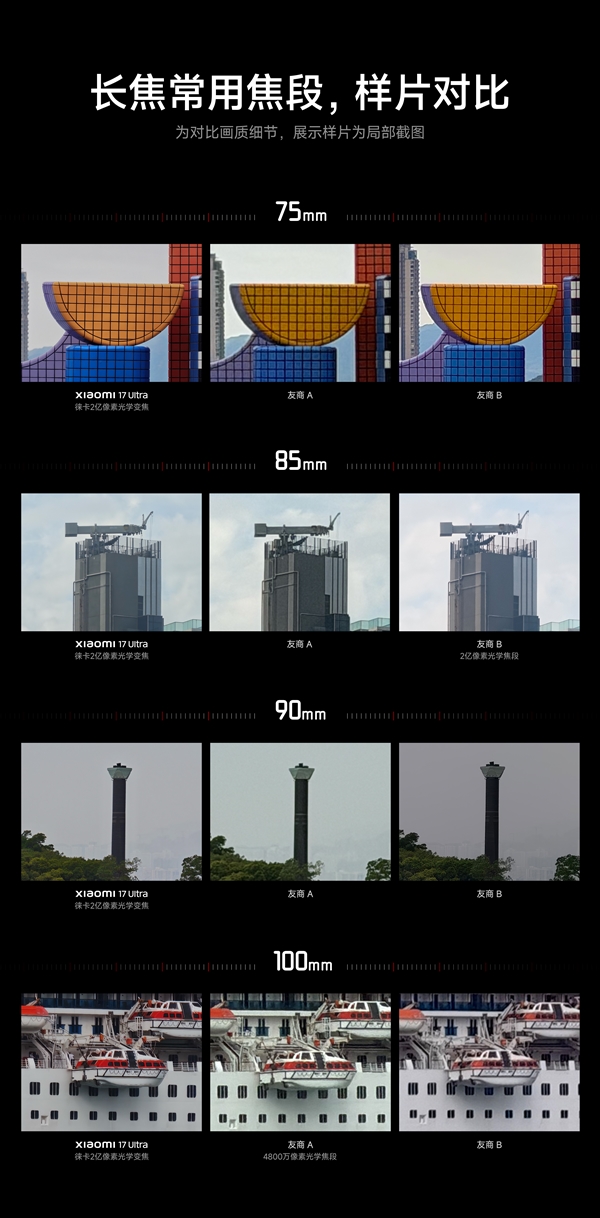 为了直观展示这款长焦镜头的实力,卢伟冰还放出了小米 17 Ultra 与友商机型的实拍对比样张。对比选取了长焦常用的 75mm、85mm、90mm、100mm 焦段,通过截取画面细节可以清晰看到:小米 17 Ultra 的样张清晰度更高,建筑纹理、植物叶脉等细节保留更丰富,色彩还原更贴近肉眼观感,算法涂抹痕迹也明显更少,画质优势一目了然。