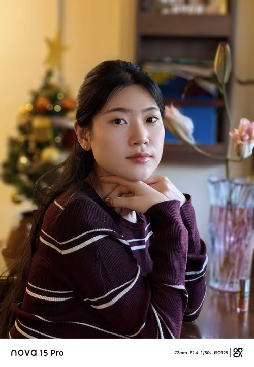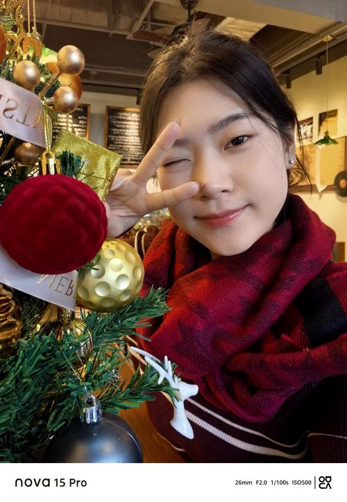 实际体验中,圣诞夜暖光漫裹的场景下,暗光环境下的肤色依旧清透,整体的色彩还原也十分准确,尤其是背景的虚化过渡非常自然,轻松拍出浪漫氛围感。