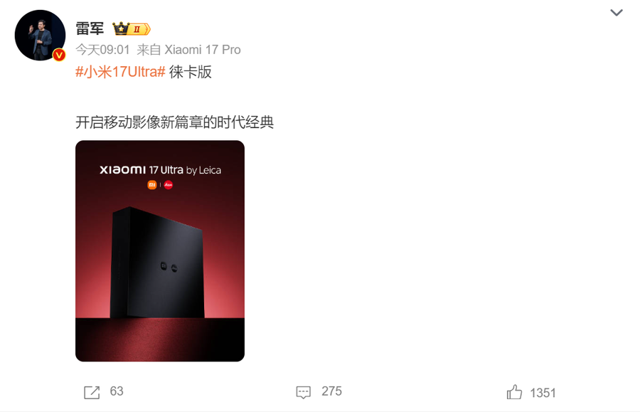 今日,小米及雷军正式宣布推出全新的小米17 Ultra徕卡版,并展示了其独特的包装盒,并且公布了一则预热视频。这款手机采用黑色设计,正面印有小米和徕卡的“可乐标”Logo,突显了两者的合作与品牌特色。