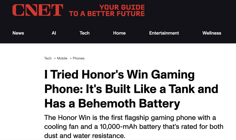国际知名科技媒体CNET在深度体验后发文《I Tried Honor's Win Gaming Phone: It's Built Like a Tank and Has a Behemoth Battery》,并表示:“荣耀WIN是首款配备散热风扇和10000mAh电池的旗舰游戏手机,并且具有防尘防水功能……它的构造坚固如坦克,电池容量巨大。”文章特别指出,尽管内置风扇,荣耀WIN仍具备IP68/69/69K防护等级,可以在水下浸泡长达30分钟,能够承受高温水柱。