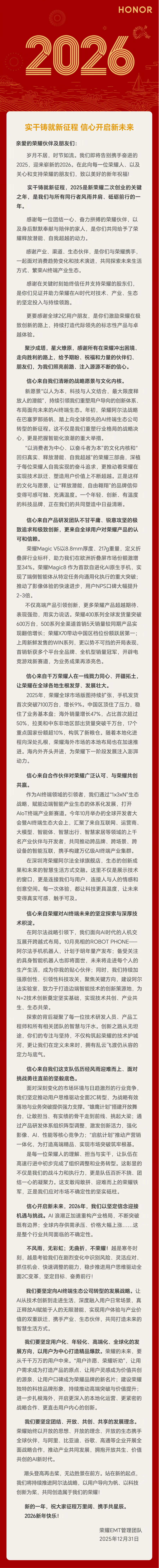 2025年12月31日,荣耀EMT管理团队发布新年致辞,以“实干铸就新征程,信心开启新未来”为核心主旨,回顾荣耀一年来跨越式发展历程,阐述面向2026年的战略布局和发展愿景。