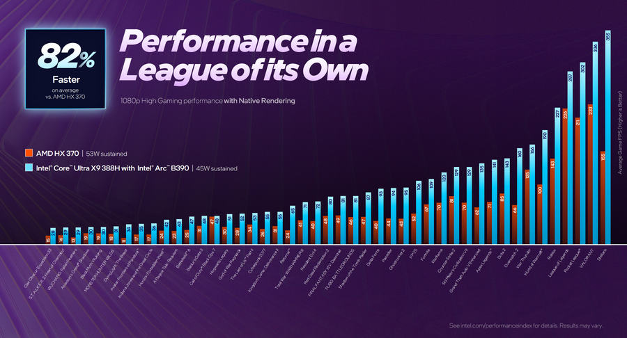 根据英特尔的官方数据显示,Arc B390在性能对比中展现出显著竞争力。对比AMD竞品:平均性能较AMD Radeon 890M(搭载于Ryzen HX 370处理器)提升73 - 82%(分别对应“2x超分”与“原生渲染”场景);