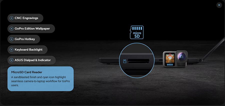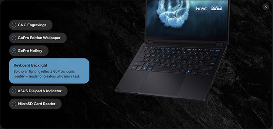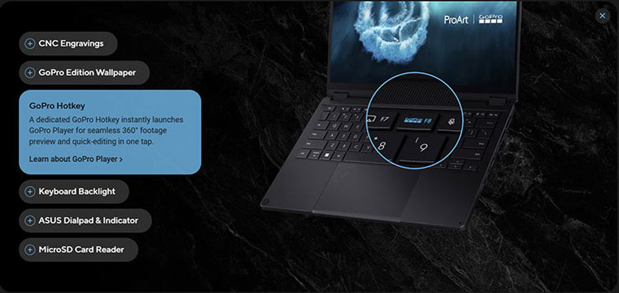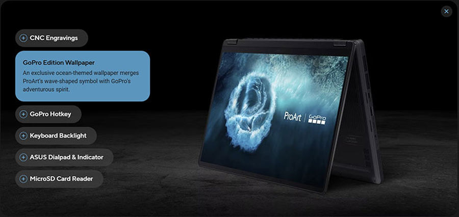 这款特别版机型基于华硕现有的ProArt PX13打造,配备13.3寸、3K分辨率的Lumina OLED触控屏幕,屏幕可翻转为平板模式,同时保留传统电脑强大的计算能力。ProArt GoPro Edition(PX13)最高可搭载AMD Ryzen AI 9 HX 370处理器和Nvidia GeForce RTX 4070显卡,这两个配置明确表明其定位,主要针对视频剪辑、图像处理和AI运算。至于许多GoPro用户期待的防水和防撞机身,这次并没有在硬件上进行强化,GoPro Edition的区别主要体现在外观设计和软件集成上。