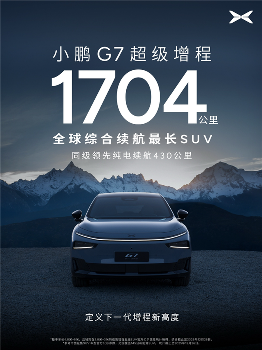 今日,小鹏汽车在广州举行2026全球新品发布会,正式推出四款全新车型,包括2026款小鹏P7+、小鹏G7超级增程以及经过焕“芯”升级的2026款小鹏G6和小鹏G9。其中,小鹏G7增程版的综合续航可达1704公里,成为全球续航最长的SUV。在零下20摄氏度的极寒环境下,该车型经过实测,续航仍可达到1108.3公里。