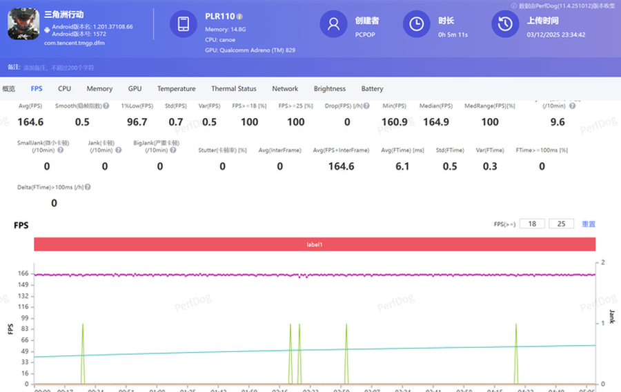 《三角洲行动》同样支持165帧游戏模式,游戏过程中平均帧率为164.6FPS,游戏体验也非常的出色。