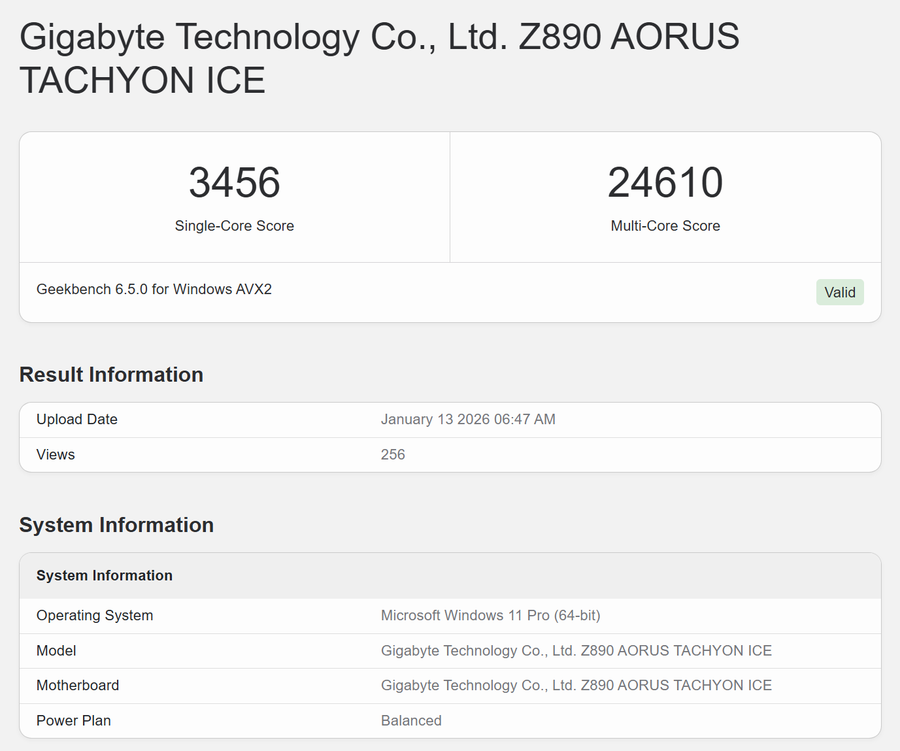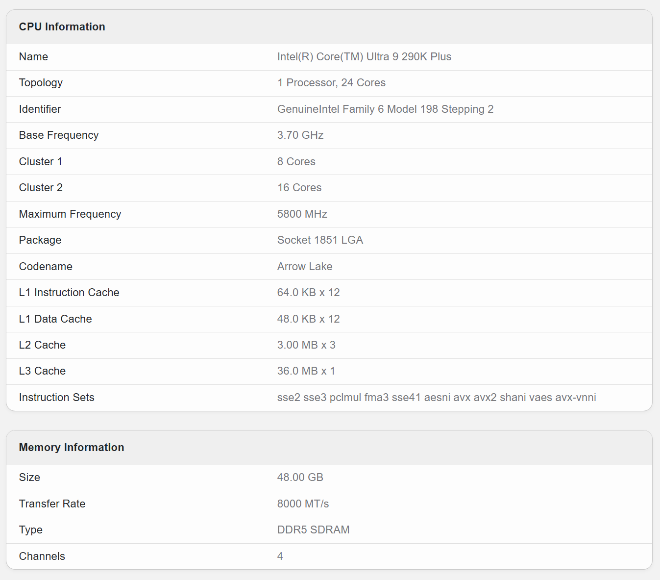 根据GeekBench数据库的信息显示,这两款处理器均采用8P+16E共24核心设计,规格与酷睿Ultra 9 285K/285HX一致,显然此次升级主要还是针对频率以及表现进行优化。具体来看,Ultra 9 290K Plus搭载于技嘉Z890 AORUS TACHYON ICE主板,搭配48GB DDR5-8000内存;Ultra 9 290HX Plus则由宏碁新款Predator掠夺者游戏本搭载。