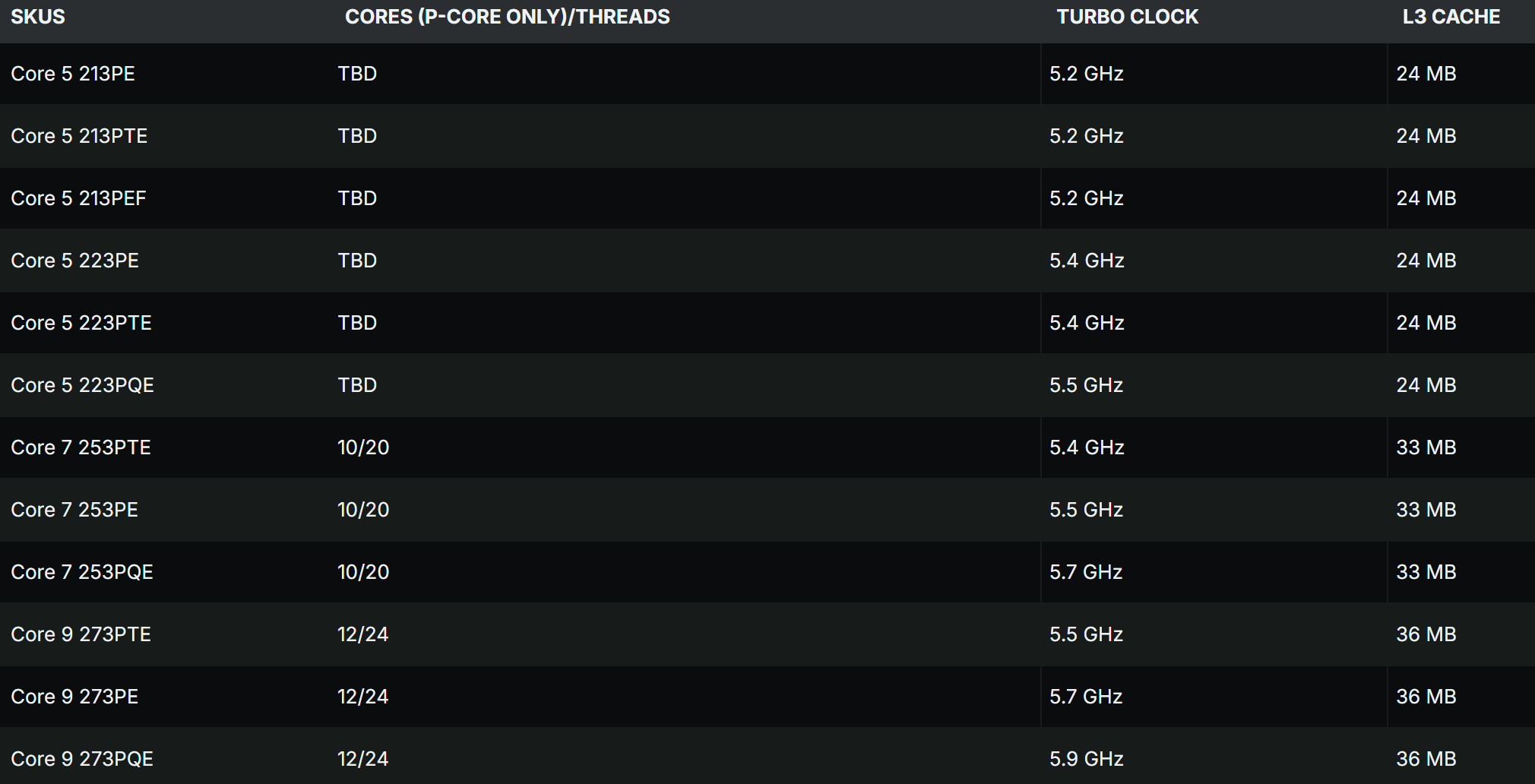 从具体规格来看,三个级别处理器在缓存与睿频上呈现清晰梯度:酷睿5系列配备24MB L3缓存,预计搭载6-8个性能核,旗下213PE、213PTE、213PEF三款型号最大睿频均为5.2GHz,223PE、223PTE睿频提升至5.4GHz,顶配型号223PQE则达到5.5GHz;酷睿7系列统一搭载10个性能核与20线程,配备33MB L3缓存,253PTE、253PE、253PQE三款型号的最大睿频分别为5.4GHz、5.5GHz、5.7GHz;旗舰级酷睿9系列则升级为12个性能核与24线程,拥有36MB L3缓存,273PTE、273PE、273PQE的最大睿频依次为5.5GHz、5.7GHz、5.9GHz,其中顶配型号273PQE的睿频较 Raptor Lake Refresh系列旗舰酷睿i9-14900KS高出200MHz,性能表现极具冲击力。