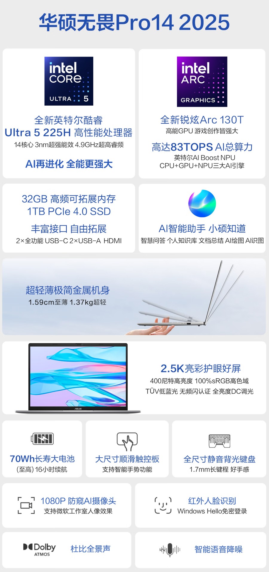 核心配置上,该机搭载英特尔酷睿Ultra 5 225H处理器,采用台积电3nm制程,能效比出色,更内置强大NPU,支持AI智能降噪、文档智能提炼、视频会议背景虚化等实用功能,大幅提升办公效率。屏幕配备14英寸2.8K屏,120Hz刷新率搭配100% sRGB色域,画面流畅清晰,色彩准确,400尼特高亮度让户外办公也无压力。机身厚度仅14.95mm,重量1.5kg,金属机身质感十足,兼顾便携性与耐用性。键盘采用1.5mm长键程设计,打字手感舒适,还支持背光功能,夜间办公更便捷,指纹识别模块则进一步提升了设备安全性。