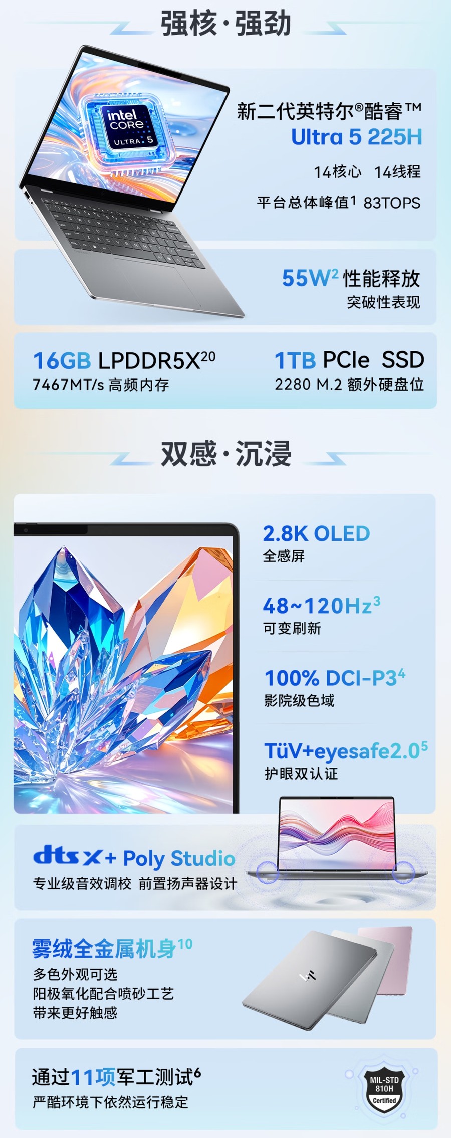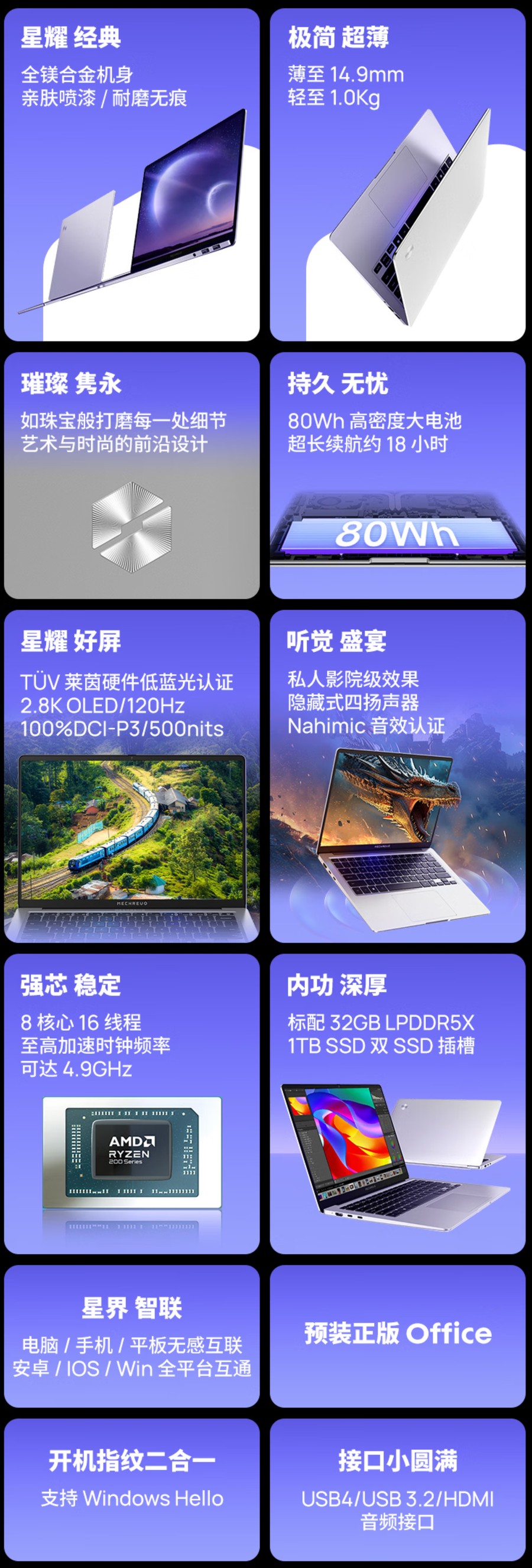 该机同样搭载锐龙7 H 255标压处理器,性能释放稳定,配合双风扇+双热管散热系统,高负载运行时温度控制出色,满载噪音也能控制在合理范围。机身采用成本极高的镁合金材质,不仅质感出众,更实现了仅约1.0kg的超轻重量和14.9mm的超薄厚度,单手即可托起,放入背包毫无压力。内置80Wh大电池,搭配OLED屏低功耗优势,本地视频播放可达18小时,满足长时间移动创作需求。同时支持100W PD快充,碎片化时间就能快速补能,还通过了莱茵低蓝光认证,长时间创作也不易视觉疲劳。