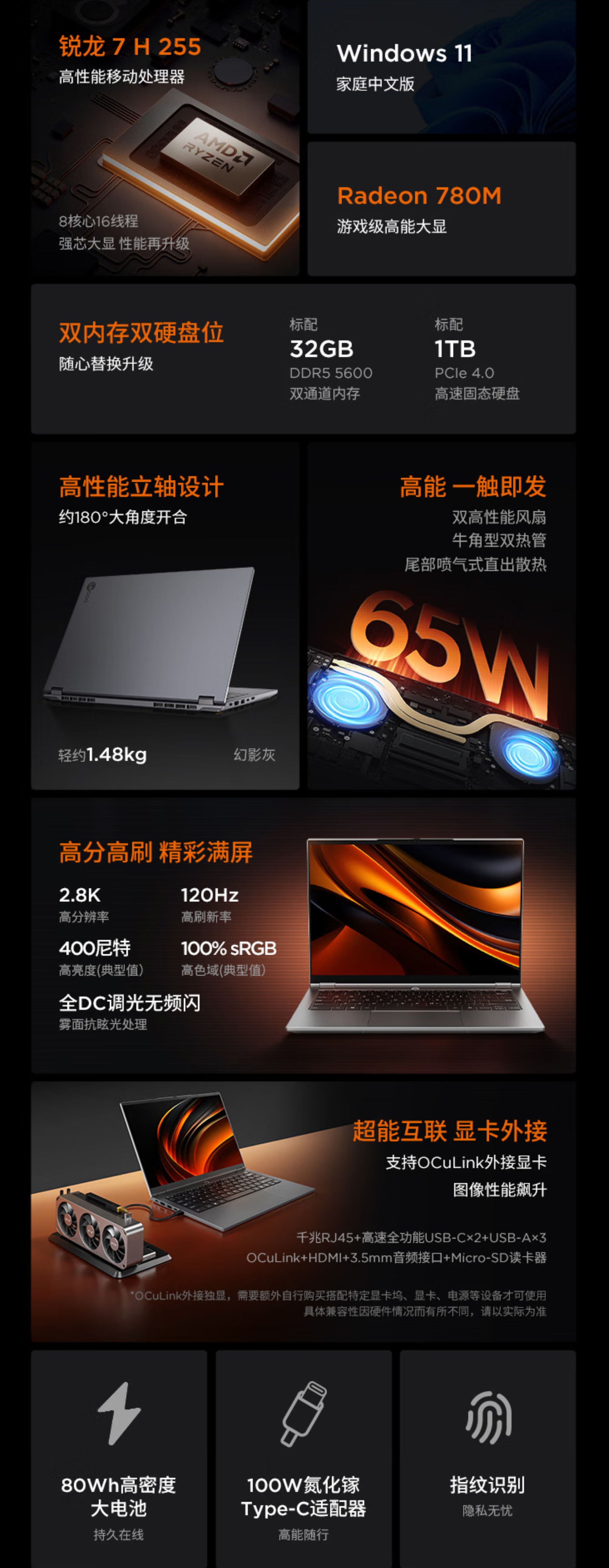 配置方面,锐龙7 H 255处理器,8核16线程设计,最高睿频4.9GHz,支持65W性能释放,配合AMD Radeon 780M核显,不仅日常办公毫无压力,甚至能流畅运行《英雄联盟》《CS2》等主流网游,轻度视频剪辑也能高效完成。屏幕方面,14英寸2.8K IPS屏搭配120Hz刷新率,覆盖100% sRGB色域,400尼特亮度即便在户外强光下也能清晰看清屏幕内容,DC调光技术更能有效减少频闪,呵护双眼。接口配置同样拉满,配备全功能USB4、全功能USB-C、双USB3.2、HDMI2.1、RJ45网口及TF卡读卡器,外接投影、移动硬盘等设备无需转接器。更惊喜的是其内置80Wh大容量电池,日常办公续航可达8-10小时,搭配100W氮化镓快充,30分钟就能充至50%,彻底告别电量焦虑。