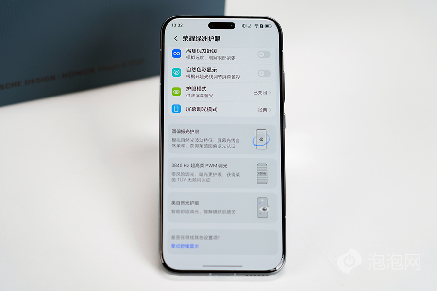当然,护眼作为荣耀的一大优势,这次在荣耀Magic8 RSR保时捷设计上也实现了满配护眼能力。融入了包括AI离焦护眼、AI干眼友好、AI助眠显示、硬件级低蓝光、晕动舒缓显示、自然色彩3.0、PWM零风险调光、类自然光护眼以及圆偏振2.0九大护眼技术。