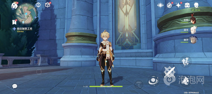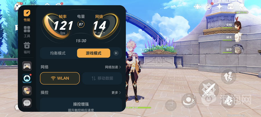 《原神》在默认高画质的设置下,开启60帧模式,并选择【帧率增强】与【画质增强】,在枫丹廷地图中进行跑图,游戏过程非常流畅,通过内置的帧率工具查看,实时帧率可以达到121FPS,游戏的画质与流畅度都得到了提升。