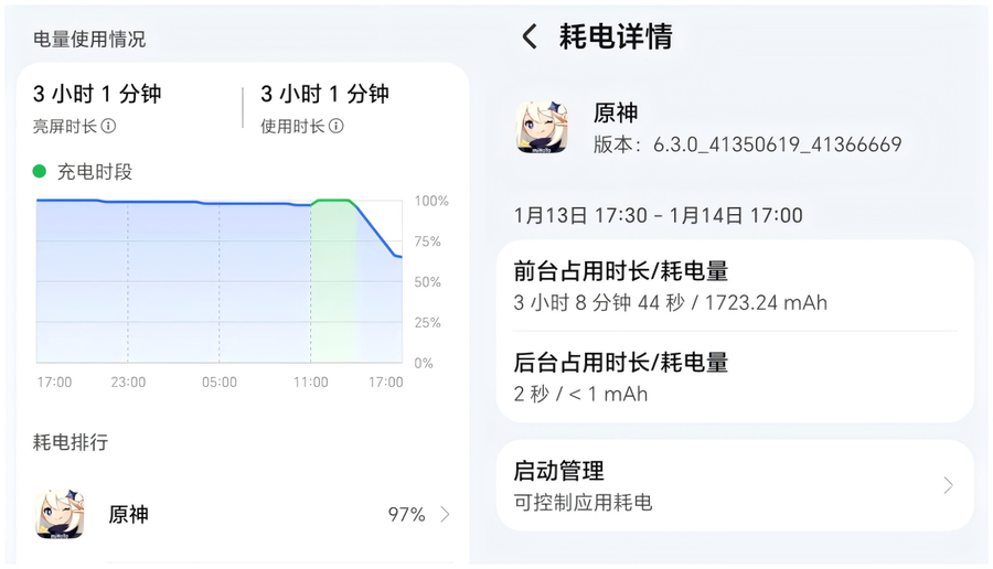 续航方面,荣耀Magic8 RSR保时捷内置7200mAh新一代青海湖电池,配合AI智慧省电技术,针对用户日常使用场景进行精细化的调控,实现更低的功耗表现。经过实测,连续3小时《原神》手机电量从100%降至65%,综合续航能力是很不错的。