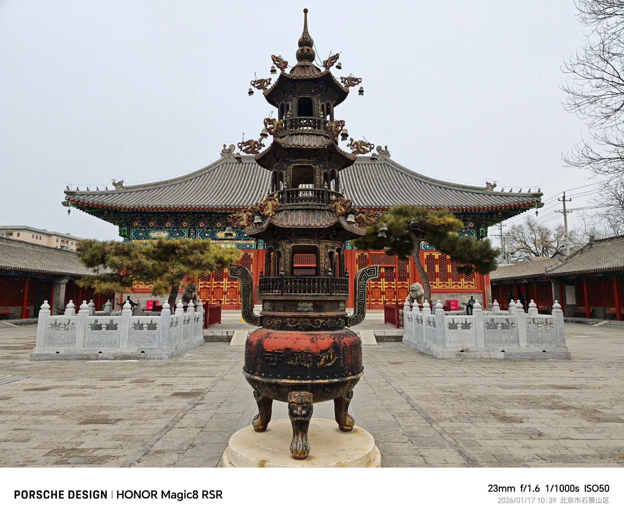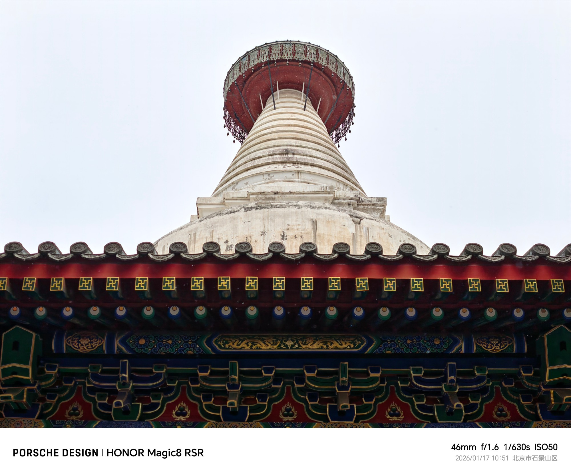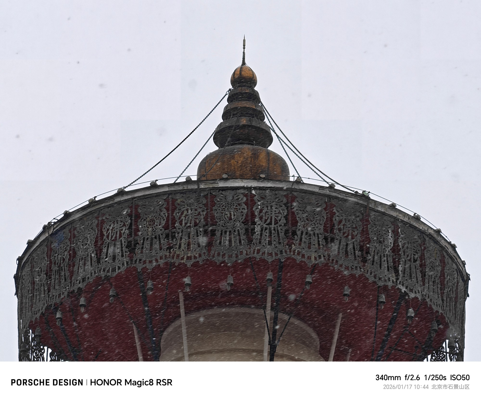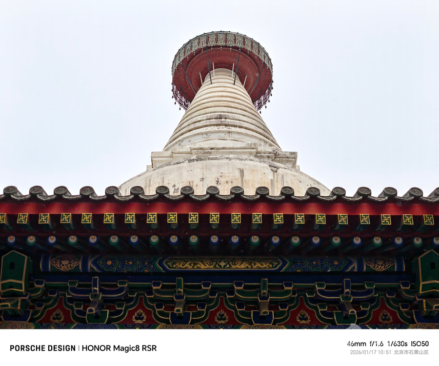 荣耀Magic8 RSR保时捷设手持情况下,可以比较轻松的在340mm焦段拍摄出清晰的长焦照片,也就是14.8倍的变焦。样张分别是23mm焦段1倍和340mm 14.8倍拍摄的,白塔顶部的装饰细节可以拍摄的很清晰。