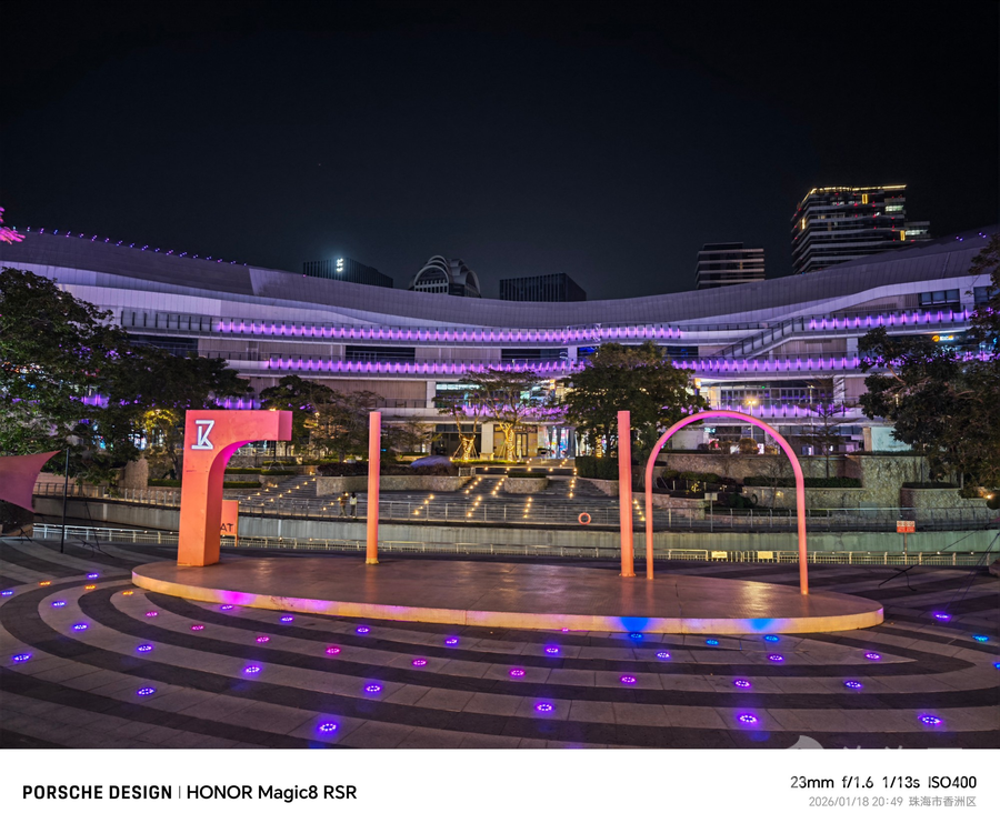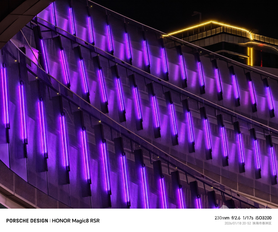 在夜景拍摄时,荣耀Magic8 RSR保时捷设计也同样具备了不错的成像能力,首先它能够真实的呈现夜间的效果,不会单纯的将整体画面提亮。此外,在面对复杂灯光的时候,也能够精准的呈现出不同的色彩,最后画面纯净,没有明显的噪点,即使长焦拍摄也十分的清晰,整体的表现十分出色。