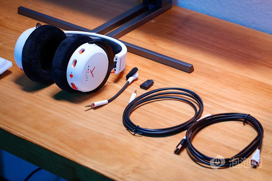 配件方面给得很齐全,包含低延迟适配器、USB-A转C口、3.5mm转USB-C两根线材,长度都有1.8米,不管是接电脑还是游戏主机都够用。可拆卸的META VOICE麦克风带防喷海绵,软性材质能自由弯曲,调整到合适的拾音角度很方便。