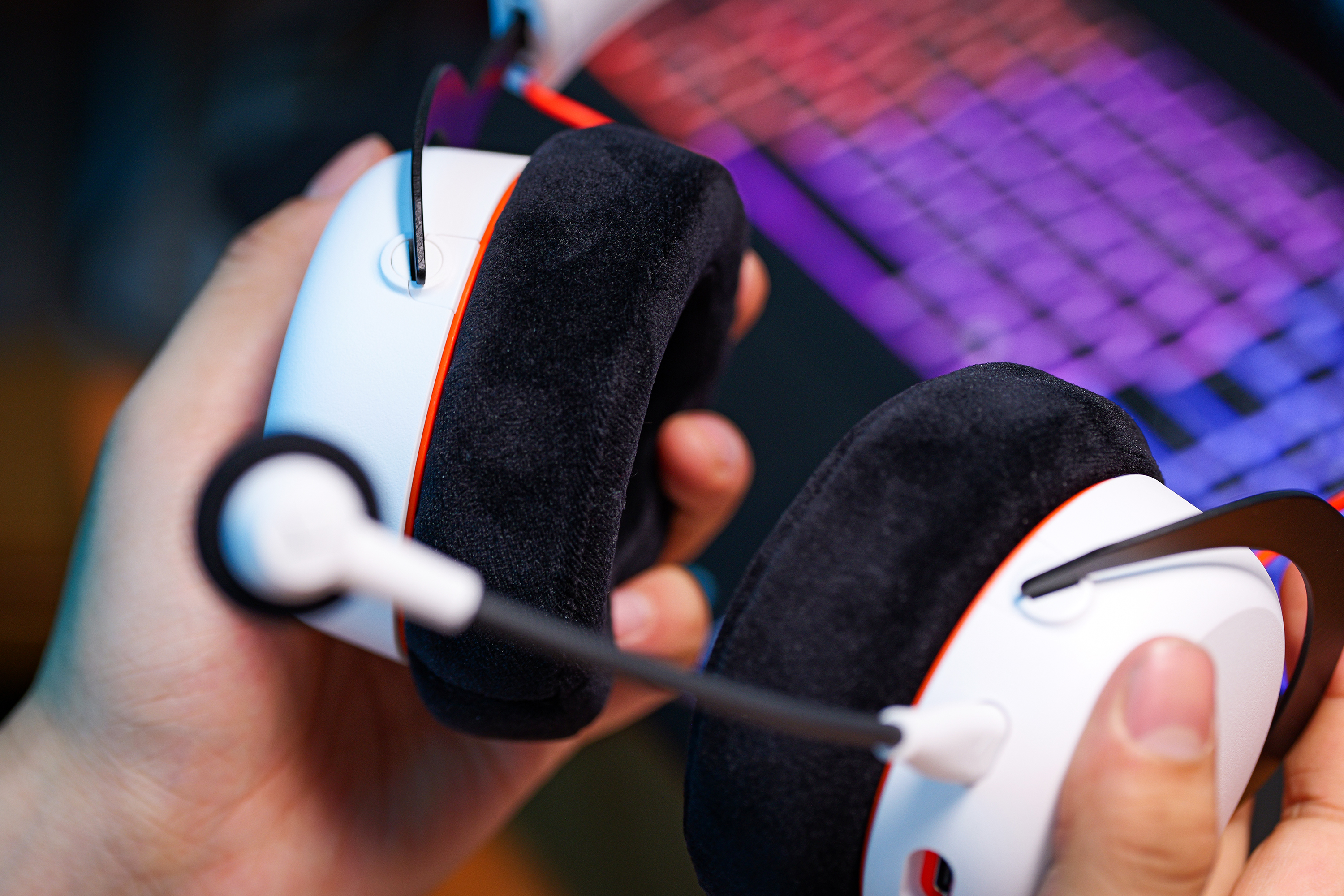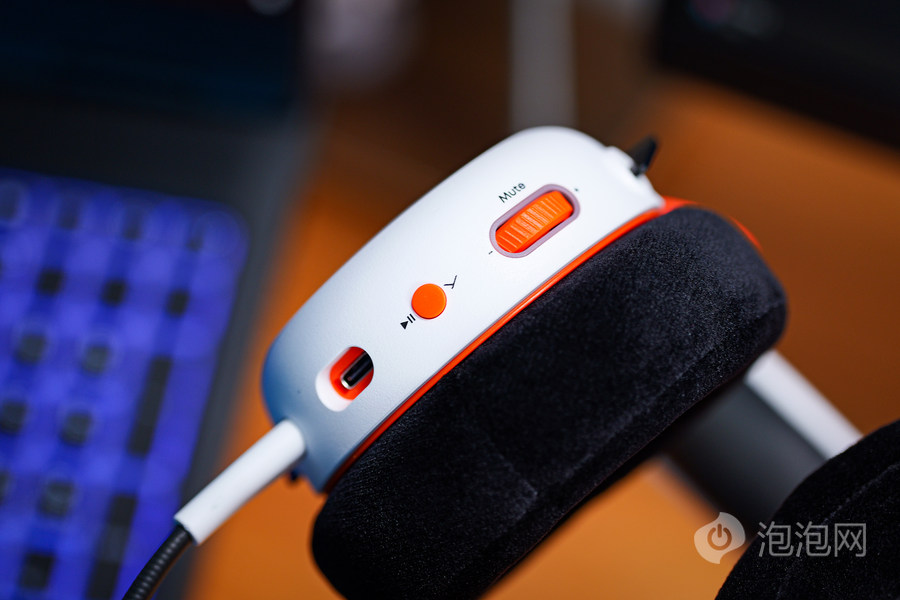 左侧耳罩是主要操作区,配备了USB-C接口、麦克风插孔和一枚Mute旋钮,所有功能都能通过这枚旋钮实现,操作逻辑简单,不用看说明书也能快速上手。旋钮外围还有环绕灯光,不同颜色对应不同工作状态,比如绿色代表增强现实模式,直观又醒目。