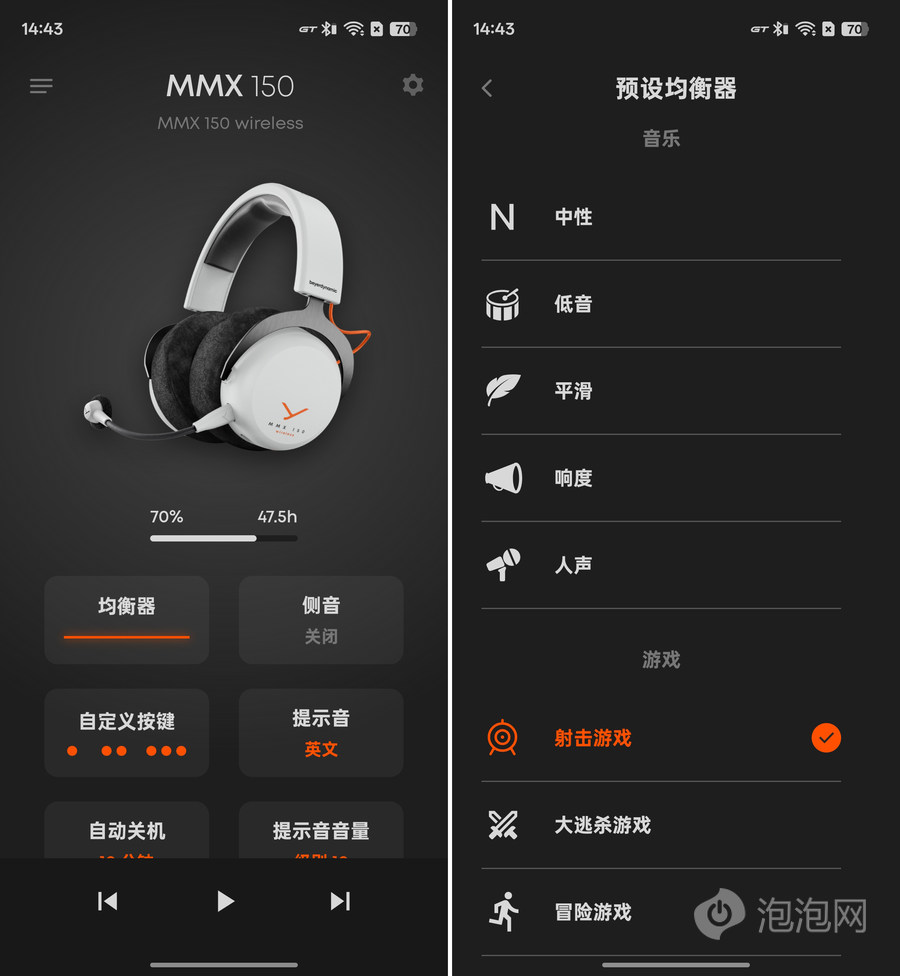 配套的beyerdynamic APP功能很实用,10频段均衡器能精准调节音效,比如玩射击游戏时可以增强低频,让脚步声更清晰;听古典乐时则可以提升高频,突出乐器细节。APP里还预设了游戏、流行、古典等多种音效模式,懒得手动调节的话直接套用就行。另外还能设置自动关机时间、切换语音提示语言,后续还能通过APP更新固件,功能很全面。
