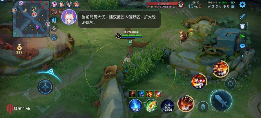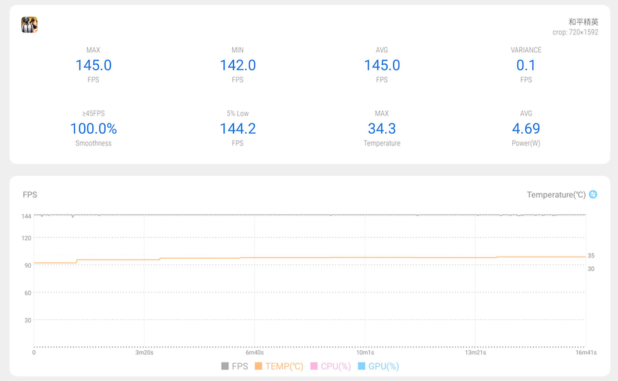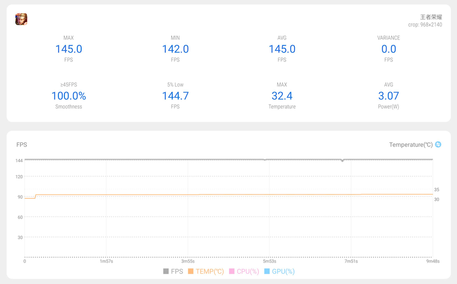 《王者荣耀》极致画质下,红魔11 Air能够实现144FPS高帧率对战,一局游戏平均帧率达到了145FPS,多人团战没有出现掉帧情况。