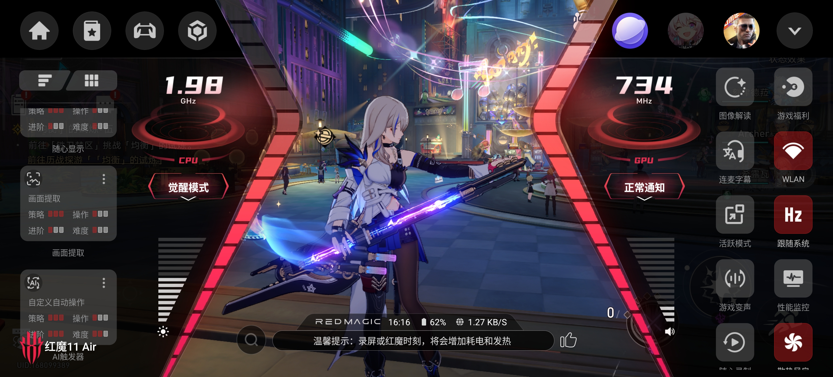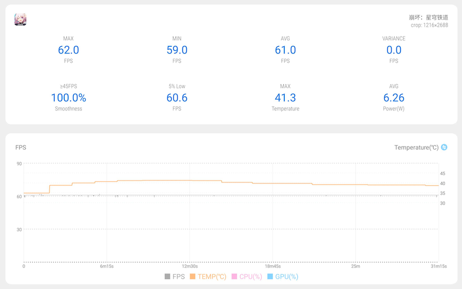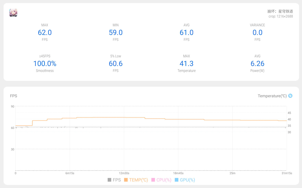面对《崩坏:星穹铁道》这类吃性能的开放世界手游,红魔11 Air依旧可以在画质特效拉满的情况下的30分钟黄金时刻跑图测试中取得61FPS的平均帧率,开启游戏超帧后,还能够以120FPS流畅运行。
