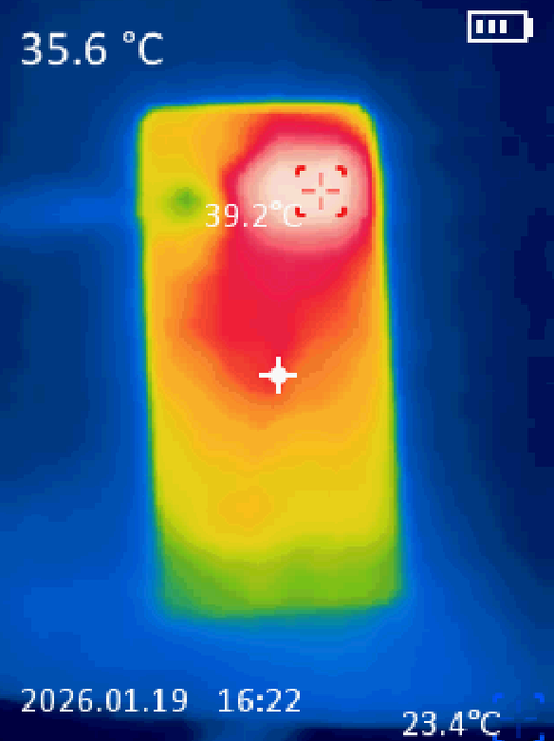 30分钟的崩铁测试后,机身背部最高温度仅39.2℃,对比无散热风扇的手机优势十分明显,而且在红外图像中可以看到热量集中在背部风扇附近,其他位置都能保持凉爽,因而在长时间玩游戏时可以明显减轻发热对手带来的不适感。
