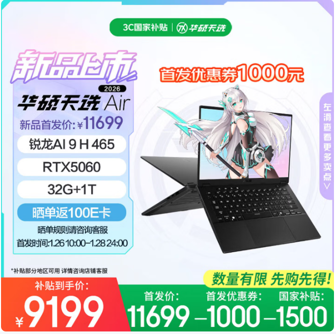 华硕天选Air 2026带来了日蚀灰与月光银两种配色,金属机身也更有质感。首销期间,用户可领取1000元首发优惠券,同时至高可享1500元国补福利,天选Air2026,32GB+1TB日蚀灰版到手价9199元,32GB+1TB月光银版到手价9499元,想要入手的用户不要错过。