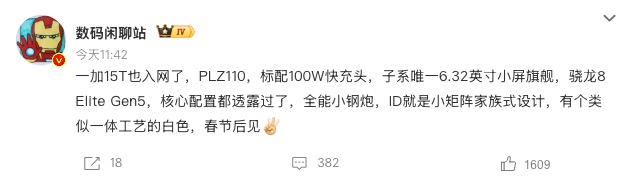 近日,一加全新机型一加15T已正式完成入网登记,机型代号为PLZ110,同步确认将配备100W快充头,为用户带来高效补能体验。据行业爆料,这款定位“全能小钢炮”的新机,预计将在春节之后正式发布,其核心亮点的是,它将成为目前子系品牌中唯一一款搭载6.32英寸小屏的旗舰机型,精准填补小屏旗舰市场的细分空白。
