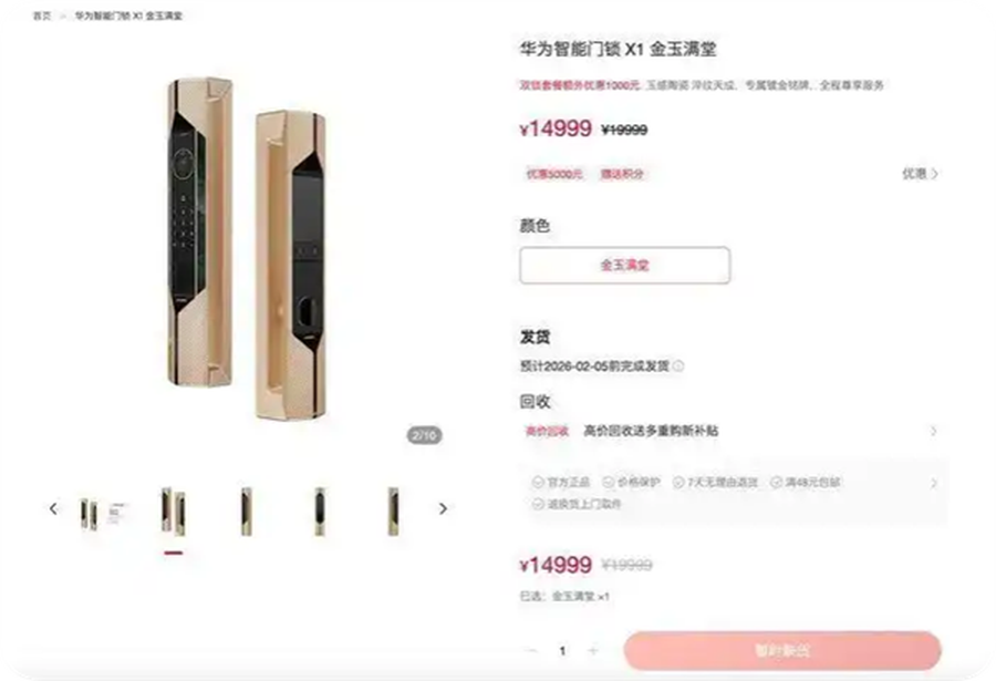 近期,华为在官方商城正式上线智能门锁X1“金玉满堂”版,这款定价14999元(原价19999元)的高端产品一经亮相,便凭借超高定价与独特设计引发市场广泛关注,其上市初期的库存波动与渠道价格分化更成为行业热议焦点。据悉,该机型除单品套餐外,还同步推出双锁套餐,售价19999元(原价25999元),此外还有一款工艺外观完全一致、但不具备门锁功能的装饰锁同步发售,定价6000元。