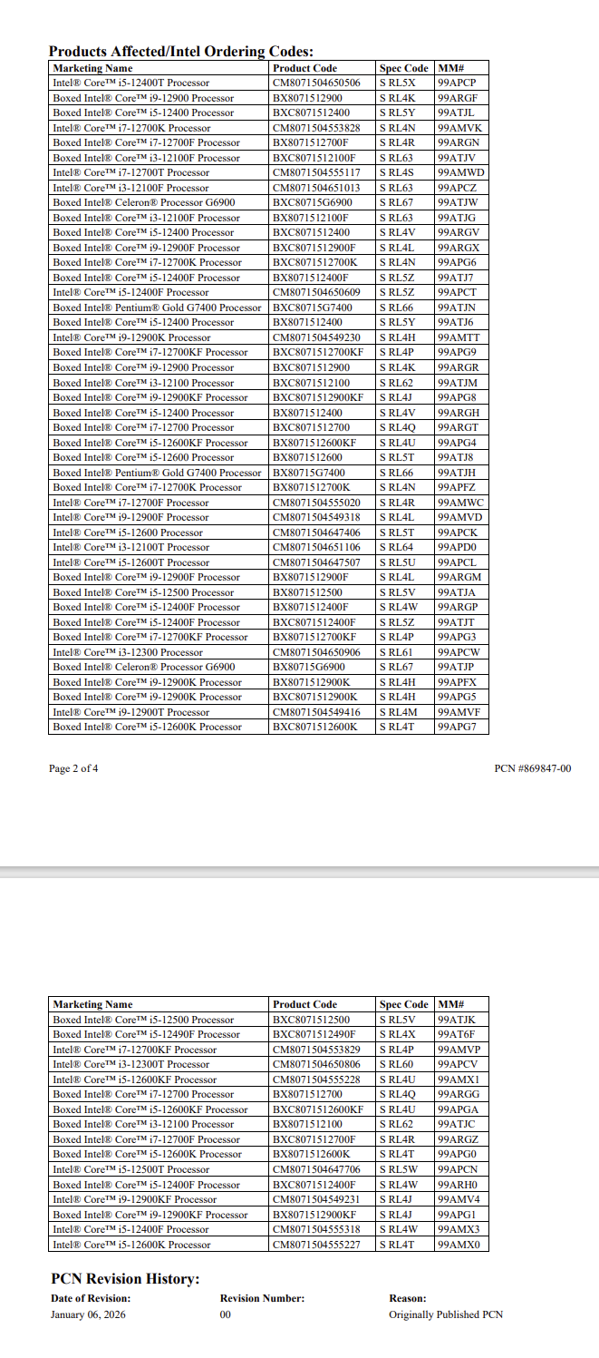 根据英特尔内部“产品变更通知”,Alder Lake-S的EOL阶段自2026年1月6日起正式启动,覆盖全系列盒装及托盘版本的桌面处理器,无任何型号例外。英特尔为市场预留了充足的过渡时间,明确要求合作伙伴需在2026年7月25日之前下达最后一批订单,而英特尔的最后发货日期则定在2027年1月22日,这意味着市场仍有超过一年的时间囤积备件、完成库存消化。值得注意的是,EOL之后,Alder Lake-S的技术支持将从英特尔架构正式过渡到英特尔嵌入式架构,针对非用户过错导致的故障处理器,其更换订单截止日期为2026年7月24日,此后将不再提供该系列产品的保修服务。
