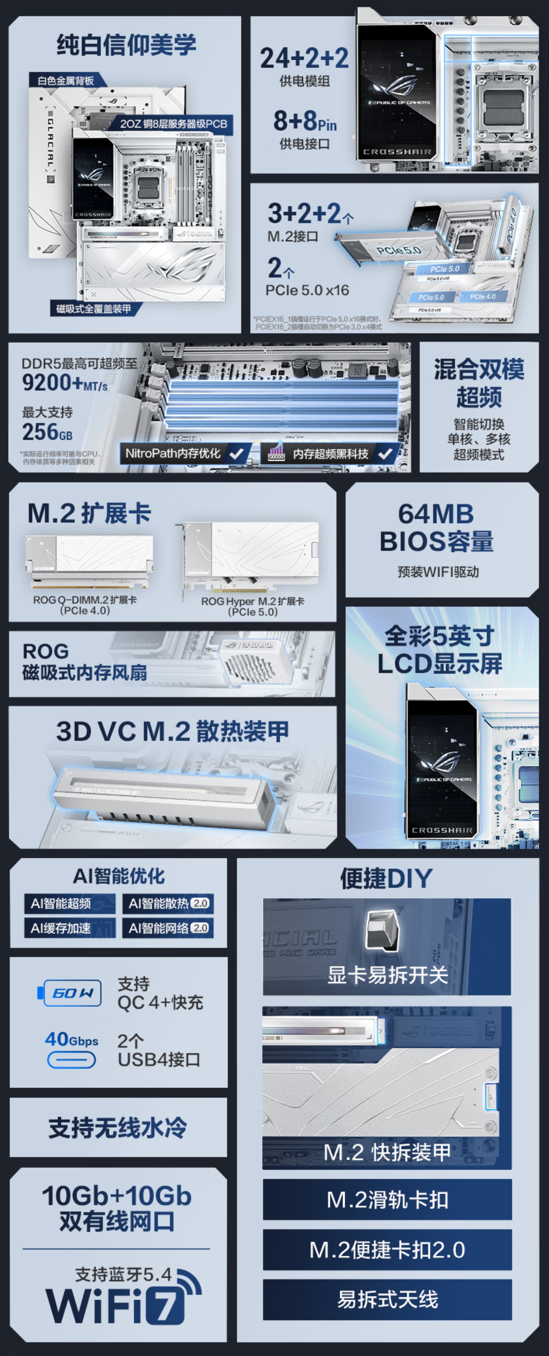 ROG CROSSHAIR X870E GLACIAL以“纯白信仰”为核心设计语言,从PCB到接口插槽采用通体纯白配色,搭配磁吸式全覆盖装甲与白色金属背板,同时将大部分接口改为侧向布局,实现正面视觉高度一体化。主板CPU供电散热装甲顶部嵌入全彩5英寸LCD显示屏,既能实时显示硬件温度、频率等状态信息,也支持导入个性化图片与自定义动画,兼顾硬件监控与玩灯需求。