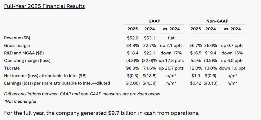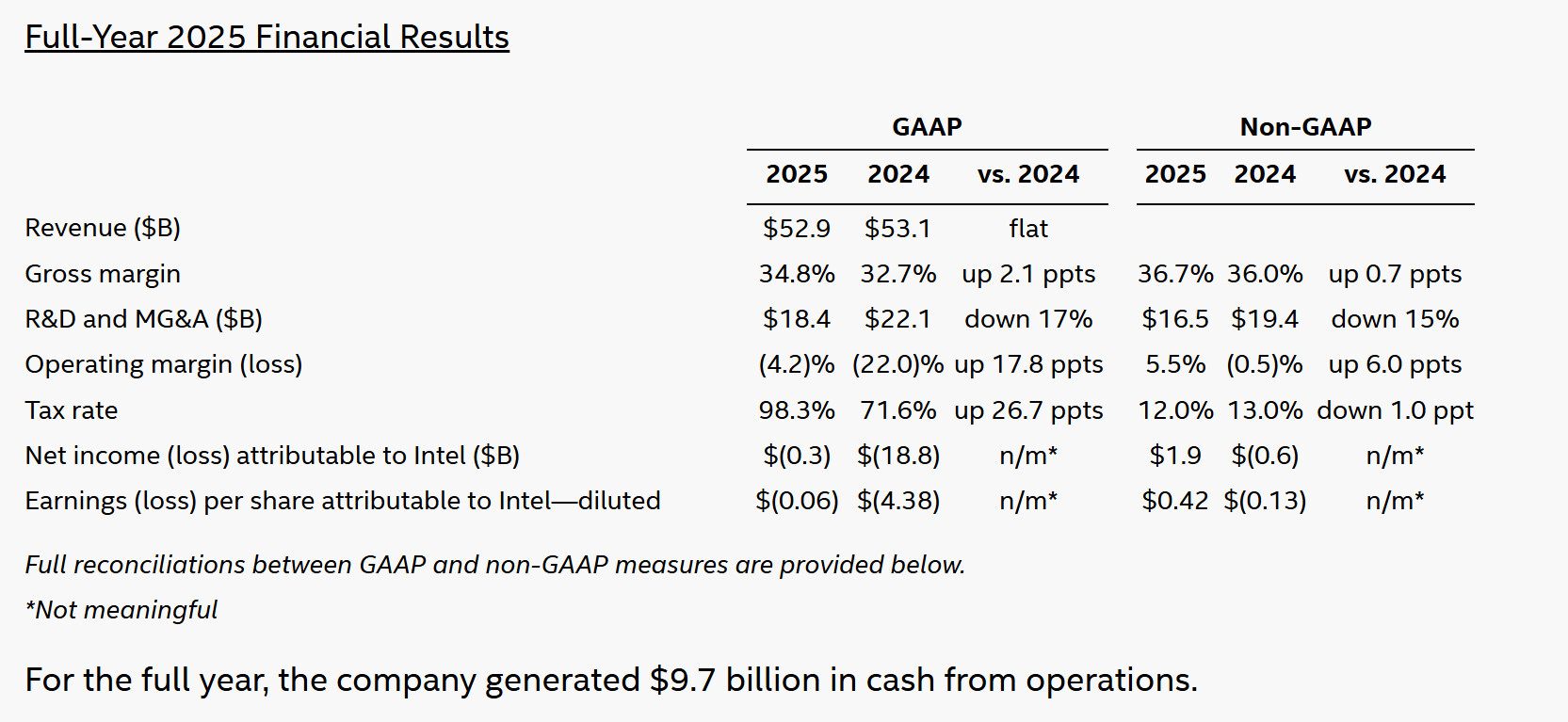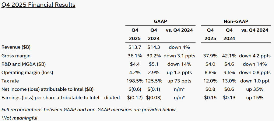 英特尔公布了2025年第四季度及全年财务业绩。公司CEO帕特·基辛格与CFO大卫·津斯纳强调了在人工智能时代CPU及x86架构的核心重要性,并宣布基于其最先进制程Intel 18A的首批产品已成功推出。尽管面临市场挑战,英特尔第四季度业绩超出预期,并在2025年全年实现了非GAAP准则下的显著扭亏为盈。在2025年第四季度,英特尔营收达到137亿美元,虽然同比下降4.1%,但较公司去年10月的预期高出4亿美元。非GAAP毛利率为37.9%,每股收益为0.15美元,同比增长15%,均超过此前展望。