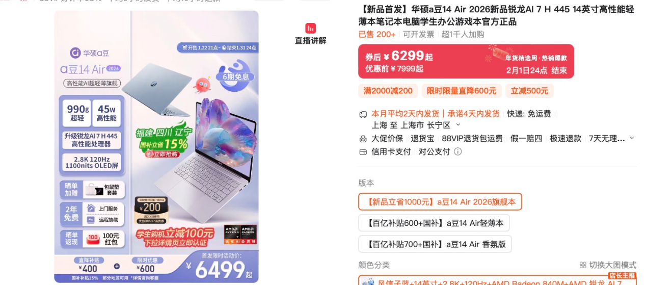 售后保障同样贴心,购机即享a豆无忧服务计划,涵盖2年硬件上门服务、2年无限远程协助、2年好屏无忧换新、2年整机保修服务,日常使用中遇到问题也能得到及时专业的解决方案,入手无后顾之忧。1月22日21:00,天猫现已正式开售,上天猫搜索“华硕a豆14 Air 2026”,直接享受补贴400元,首发限时优惠600元,更有学生购机立减100元优惠,到手券价6299元起,部分地区可以享受15%的国家补贴(详情可咨询客服了解)。