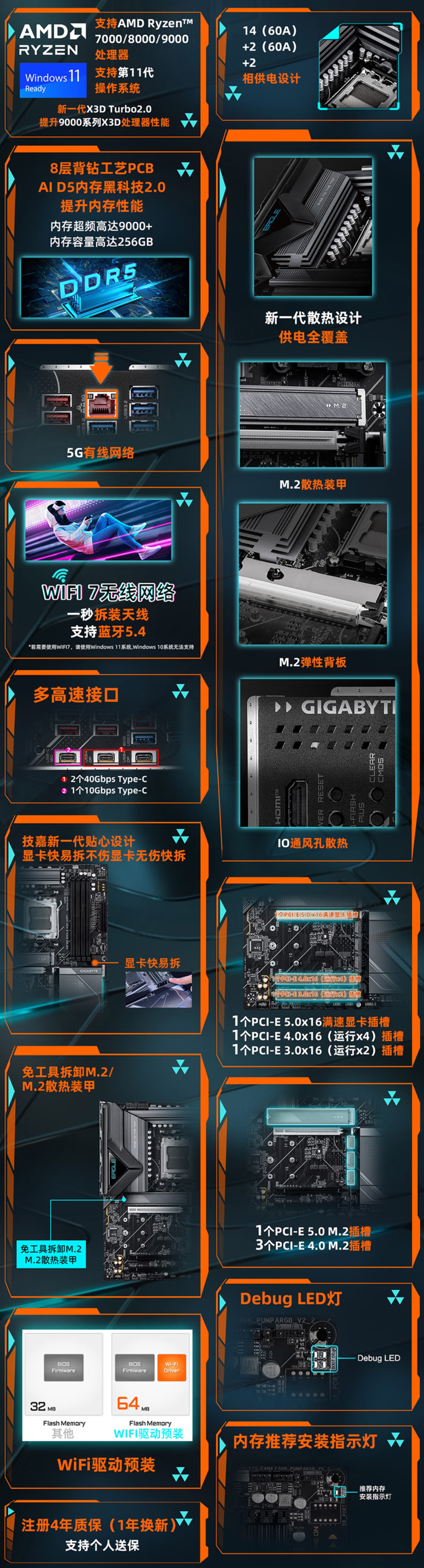技嘉X870E EAGLE X3D WIFI7主板采用标准ATX板型,供电部分采用14+2+2相60A DrMOS供电方案,搭载8层2盎司铜低阻抗PCB,有效降低信号干扰,为硬件稳定运行提供坚实保障。主板搭载AM5 CPU底座,全面支持AMD Ryzen 7000、8000G及9000系列处理器,完美适配新一代X3D处理器的性能优化需求。内存方面,主板配备四条DIMM内存插槽,最高支持DDR5-9000+(OC)超频规格,单条最大支持64GB,总容量上限达256GB,同时兼容Intel XMP 3.0与AMD EXPO内存超频配置文件,方便玩家一键开启高频内存性能。