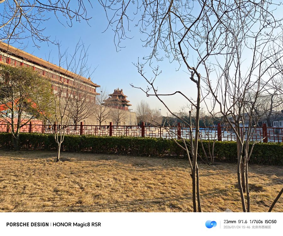 在默认情况下,荣耀Magic8 RSR保时捷设计在23mm焦段时拍摄角楼只能隐约可见,无法分辨出细节。
