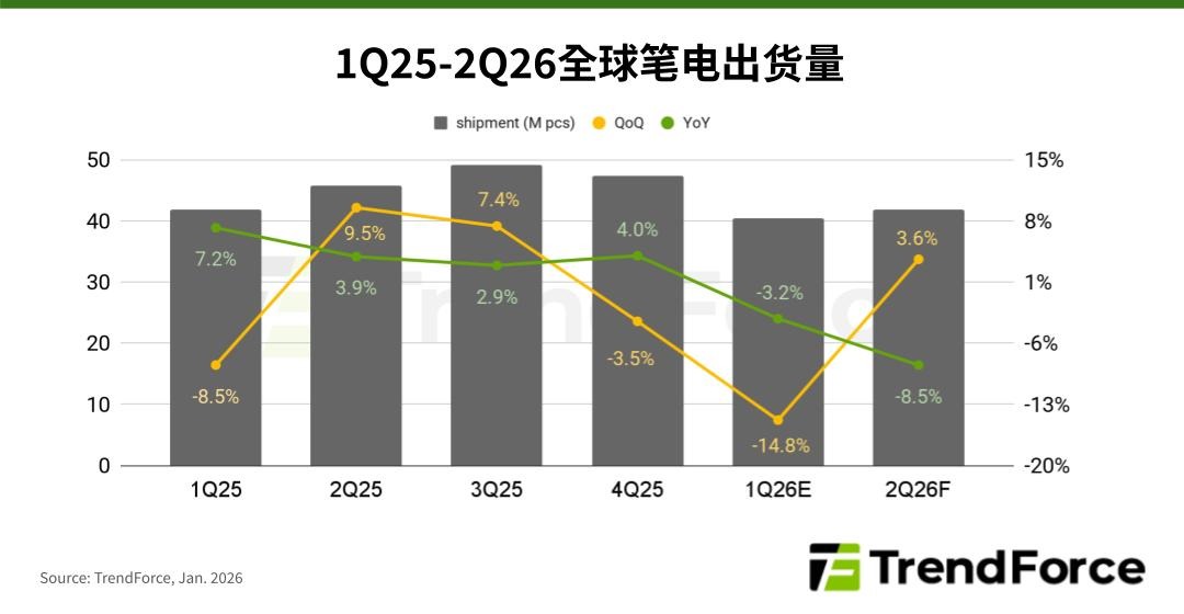 TrendForce集邦咨询近日发布了最新的行业报告,对全球笔记本电脑市场出货量做出前瞻预测。报告显示,受多重成本压力影响,2026年一季度全球笔电出货量将环比衰退14.8%,预计到二季度才有望迎来3.6%的温和环比回升;从全年维度来看,2026年全球笔电出货量将同比下滑9.4%。从1Q25-2Q26的出货趋势来看,此前连续三个季度的环比增长在2025年第四季度后转向下行,反映出行业短期承压的态势。