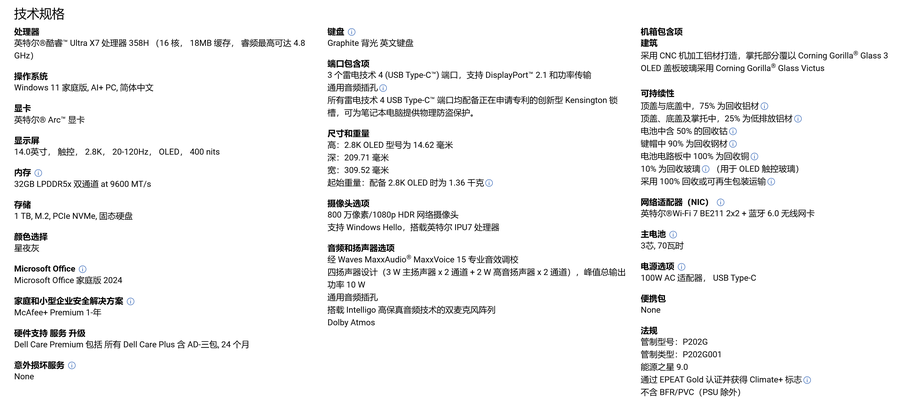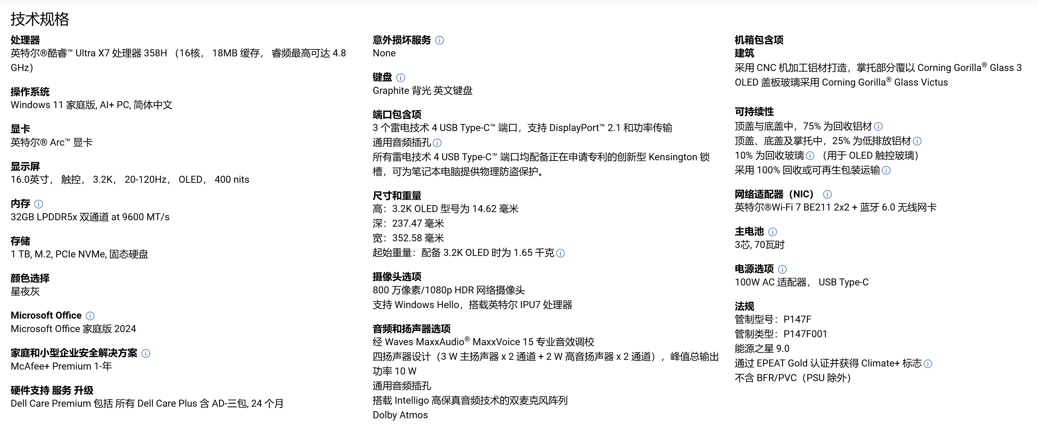 2026款Dell XPS 16英寸轻薄本在屏幕尺寸和视觉体验上进一步升级。核心配置与14英寸型号保持一致,同样搭载英特尔酷睿Ultra X7 358H处理器,搭配32GB LPDDR5x-9600高频内存和1TB M.2 PCIe NVMe固态硬盘,性能表现稳定且强劲,能够轻松应对创意设计、视频剪辑等更高强度的使用场景。机身设计上,该机与14英寸版本保持统一风格,同样采用CNC铝合金机身和Corning Gorilla Glass 3玻璃掌托,细节配置也完全同步,四扬声器音频系统、70Wh大容量电池以及Windows Hello人脸识别摄像头一应俱全,兼顾质感、实用性与安全性。
