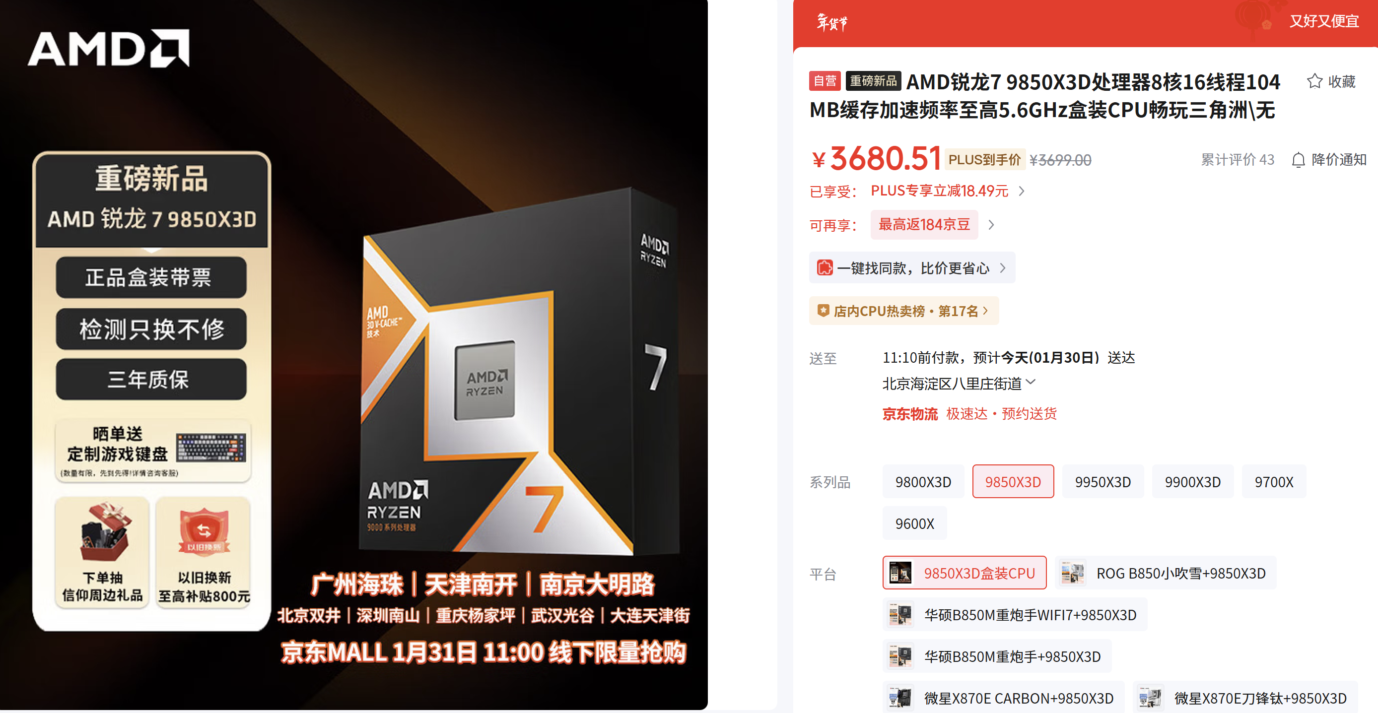 在CES 2026上,AMD此前已经发布了全新的锐龙7 9850X3D处理器,将巅峰游戏性能带到新高度。目前该款处理器已经在国内正式上市,中国大陆市场建议零售价为3699元。作为锐龙7 9800X3D 的升级型号,新品将加速时钟频率提升 400MHz,达到 5.6GHz 的新高度,进一步巩固其在高端游戏处理器市场的地位。
