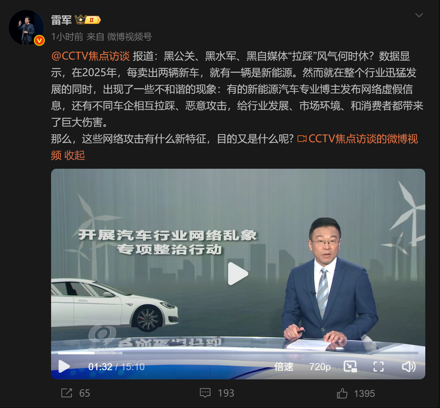 近日下午,雷军直接转发央视《焦点访谈》起底新能源汽车网络黑产的报道,表示: “黑公关、黑水军、黑自媒体‘拉踩’风气何时休?”。狠狠戳中了新能源汽车圈长久以来的积弊,也让行业里那些见不得光的恶意互黑乱象,被推到了舆论的风口浪尖。