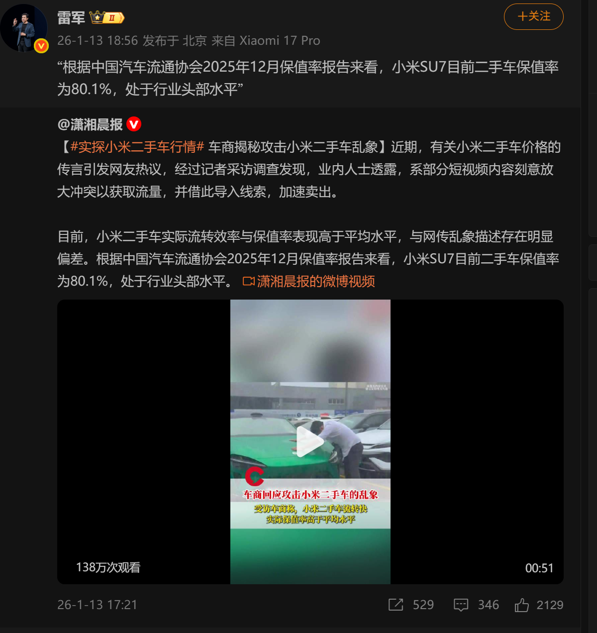 为了让网友更直观地了解情况,雷军展示了中国汽车流通协会与精真估联合发布的“2025年度中国汽车保值报告”。该报告数据显示,小米SU7的2025年度纯电车型在保值率方面表现优异,达到86.05%,不仅排名第 一,还成为保值率最强的电动汽车。雷军对这些二手车商的言论表示不解,并呼吁网友在遇到类似情况时积极举报。