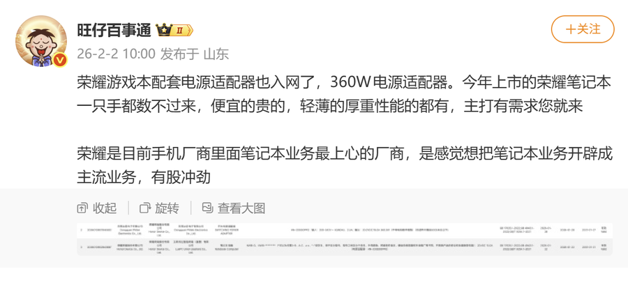 据悉,今年荣耀笔记本新品数量充足,从便宜到高端、轻薄到厚重性能款全覆盖。备受期待的游戏本将登场,配套360W电源适配器已入网,这个规格的电源适配器意味着荣耀很有可能将会带来其首款旗舰游戏本产品。轻薄全能本延续长续航优势,推出星辰灰、浮光金配色,预计将与Magic V6折叠屏手机同步亮相,后者3月1日在MWC 2026全球首发,国内3月中下旬开售,同期还有新款平板推出。