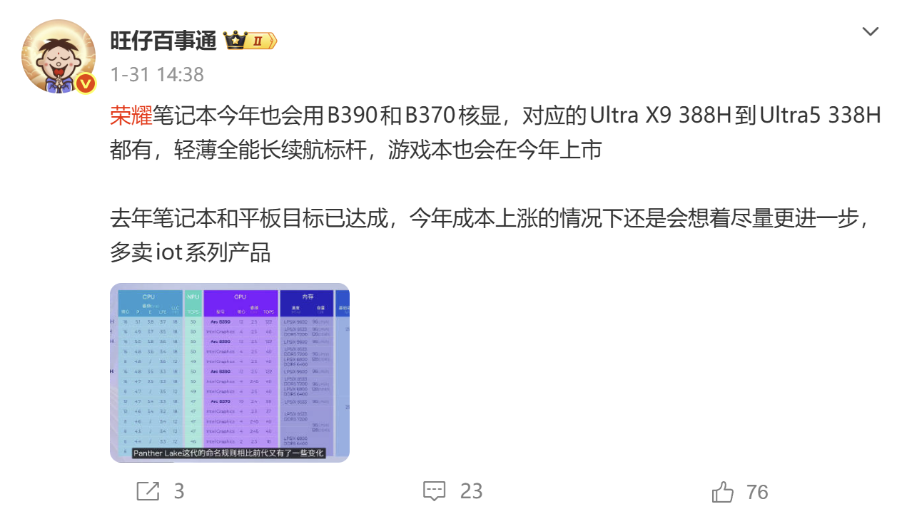 新品全面搭载英特尔PTL平台处理器,覆盖Ultra X9 388H至Ultra 5 338H全规格,X7、X9高端版本确认推出。该平台核心升级在核显与AI算力,也是荣耀今年的发力重点。核显搭载Arc B390与B370,前者定位高端,12颗Xe³核心,跑分约9400分;后者适配主流轻薄本,10颗Xe³核心,兼顾性能与功耗。AI算力上,PTL平台依托CPU、GPU与NPU协同,Ultra X9 388H的iGPU在LLM性能、视频分析功耗比上大幅提升,支撑多类AI工作负载。轻薄本曝光三款配置,均配备92Wh大电池,分别为Ultra 5 325+16GB内存+1TB存储,及Ultra 5 336H/338H搭配32GB内存+1TB存储,进一步巩固长续航优势。