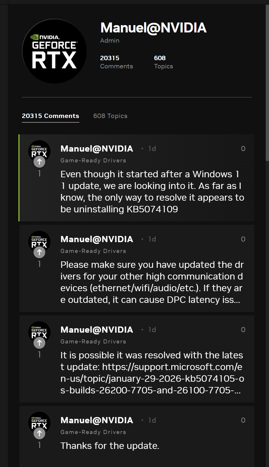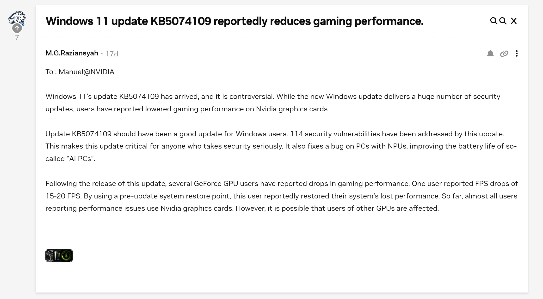 据外媒Windows Latest消息显示,英伟达已正式着手调查微软Windows 11 1月累积更新KB5074109引发的游戏兼容性问题,此前大量用户反馈该更新导致游戏性能严重下滑、画面出现异常等故障,引发广泛关注。据悉,KB5074109作为2026年首个Windows 11强制累积更新,仅包含安全修复内容,却意外引发多项问题,其中游戏相关故障尤为突出。英伟达官方论坛及微软反馈中心均出现大量用户投诉,核心问题集中在画面矩形伪影与性能衰退两大方面。
