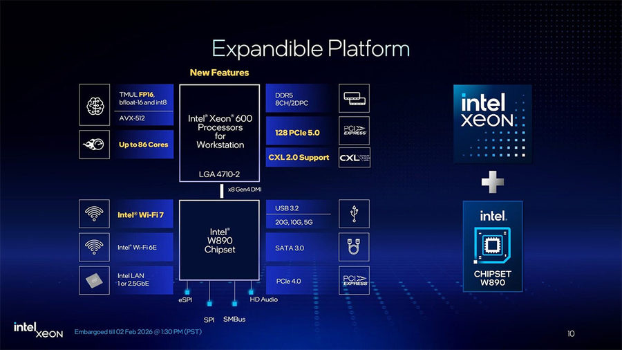 英特尔此次共推出11款型号,摒弃前代主流与专家级分类,统一归入至强600系列,其中6款带X后缀型号支持超频,5款为普通主流型号,覆盖不同专业用户需求。全系列采用FCLGA4710插槽,需搭配W890芯片组主板,核心规格梯度清晰。旗舰型号至强698X采用双计算芯粒设计,拥有86核172线程、336MB三级缓存,基础频率2.0GHz、睿频可达4.8GHz且支持全解锁超频;次旗舰696X为64核128线程,48核至24核型号采用HCC芯粒,20核及以下为LCC芯粒。