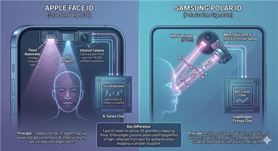 和苹果Face ID依赖的3D深度映射不同,Polar ID的核心突破在于采用偏振光成像原理,无需笨重的多组件搭配,就能实现顶级安全防护。它是一套高度软硬结合的系统,工作时会向用户面部发射红外光,反射光线经特制超构光学元件过滤后,专用传感器会同步捕捉面部视觉图像与独特的偏振状态数据。