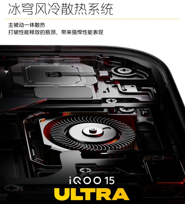 性能这么强,当然和散热密切相关。iQOO 15 Ultra机身里塞了一个17×17×4mm的大风扇,包含59片扇叶。机身内还有铝合金风道,紧挨着核心热源,还有8000mm²的单层VC均热板、16000mm²的导热石墨,再加上气凝胶、热凝胶这些材料,一套组合拳下来,散热效果直接夯爆了。
