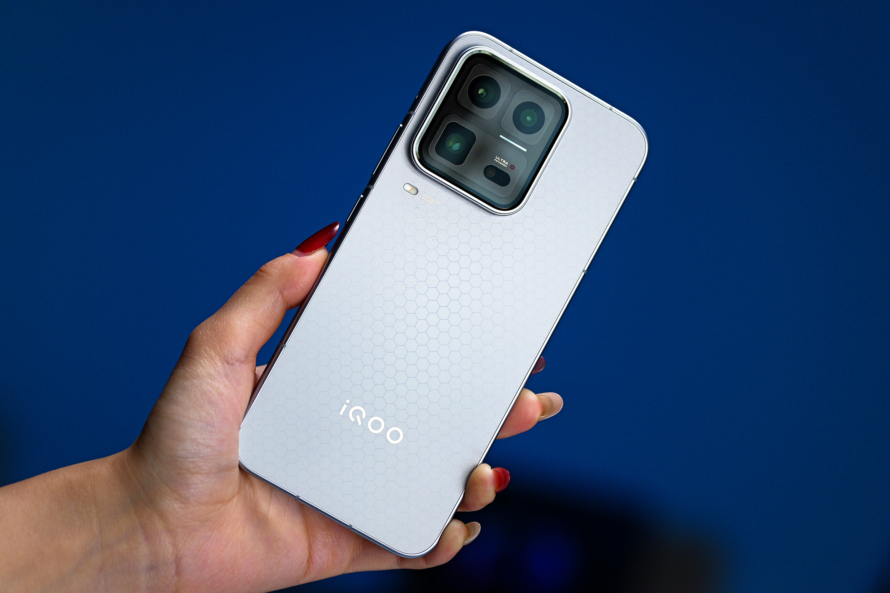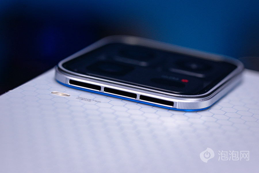 我们这台配色叫2049,致敬的就是电影银翼杀手,底色是很漂亮的哑光银,上面还有六边形蜂巢纹理,转动一下手机,还能看到蓝色的流光变化,一开始我还以为这也是灯带呢。