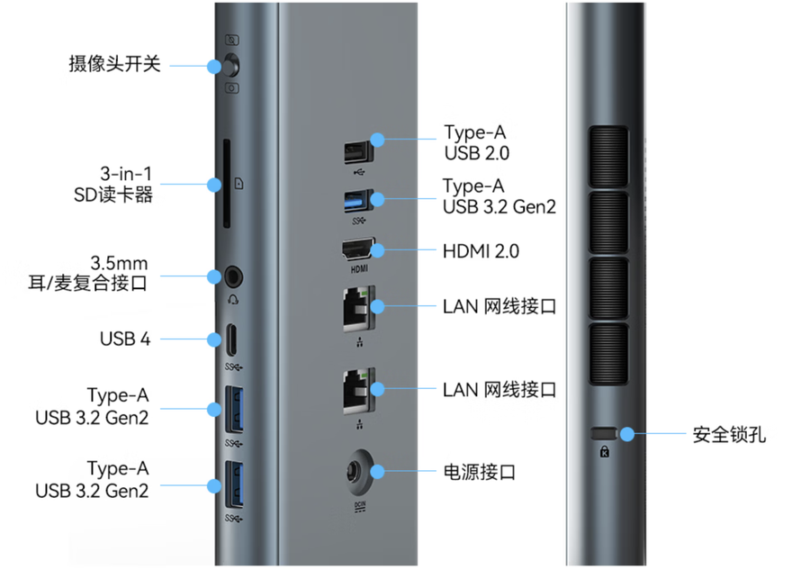 该机在外观设计上秉持极简理念,采用深灰色调,机身通过屏幕后壳一体成型工艺打造,前壳配备高透玻璃,后壳与支架选用阳极氧化铝合金,兼顾稳固性与细腻触感,15mm纤薄机身大幅节省桌面空间,固定式支架支持-5°~+21°俯仰角调节,适配多场景视角需求。扩展方面,机身内置2个3W立体声扬声器,搭载AMD RZ616无线网卡,支持WiFi 6与蓝牙5.2,同时配备双2.5GbE LAN网口满足高速联网需求。接口布局合理,涵盖3个USB 3.2 Gen 2 Type-A、1个USB 4、1个USB 2.0、1个HDMI 2.0、三合一读卡器及3.5mm音频接口,还配备Kensington锁接口,兼顾多设备扩展、高速传输与设备安全。