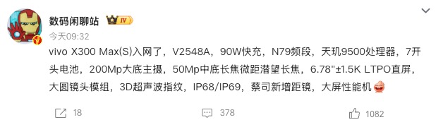 目前,vivo X300 Max已顺利入网,各项筹备工作正稳步推进,关于该机的完整配置、售价及发布时间,尚未有官方明确信息。作为蓝厂首款Max旗舰,其大屏、长续航、全焦段影像的组合,已提前引发市场广泛关注,其最终实际体验与市场表现,值得消费者与行业共同期待。