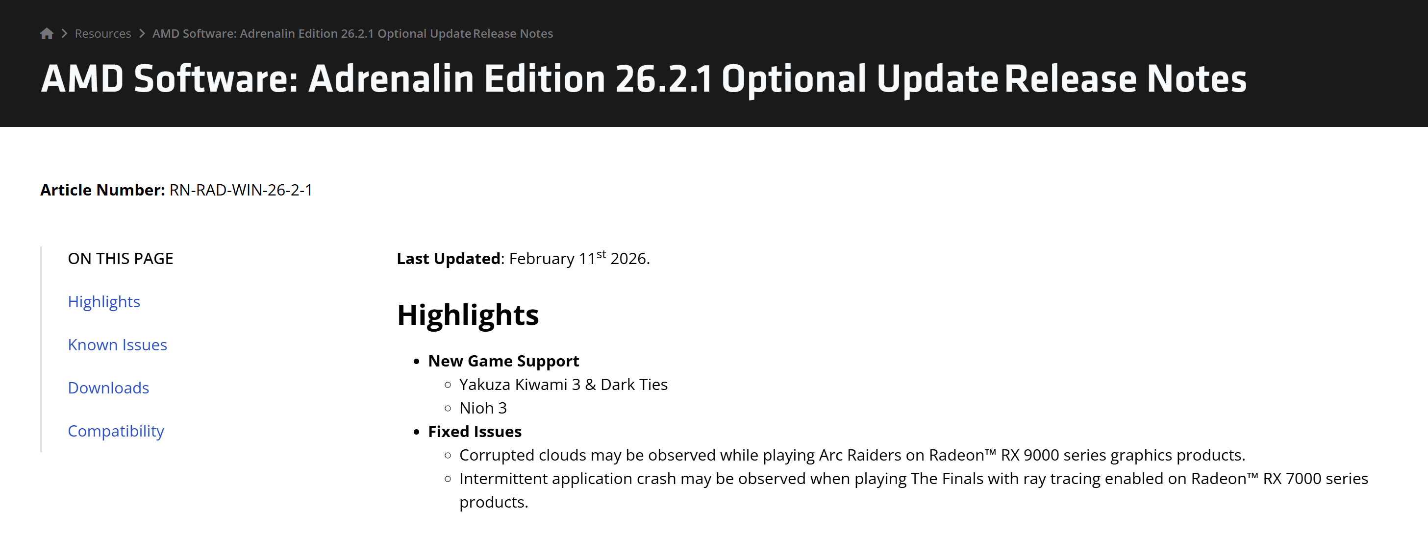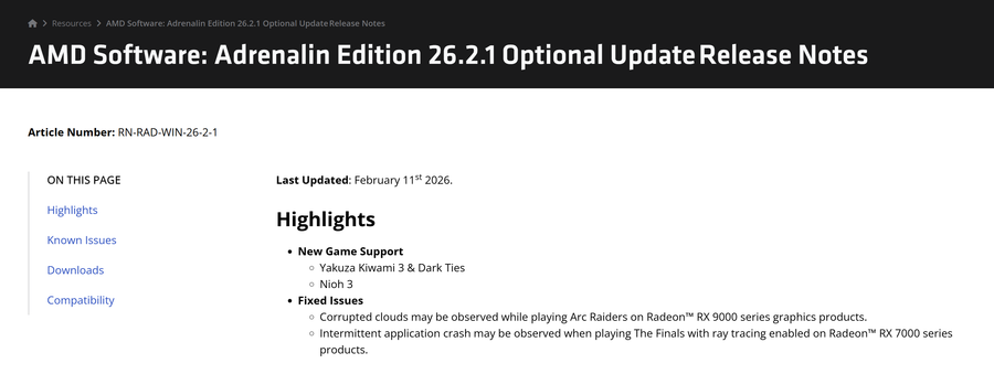 AMD日前发布AMD Software Adrenalin Edition 26.2.1版本驱动程序,为《仁王3》及《如龙 极3 / 如龙3 外传 Dark Ties》提供首发日优化支持,同时修复了Radeon RX 9000系列显卡运行《ARC Raiders》时可能出现的云层损坏异常,以及Radeon RX 7000系列显卡开启光线追踪游玩《The Finals》时的间歇性应用崩溃问题。